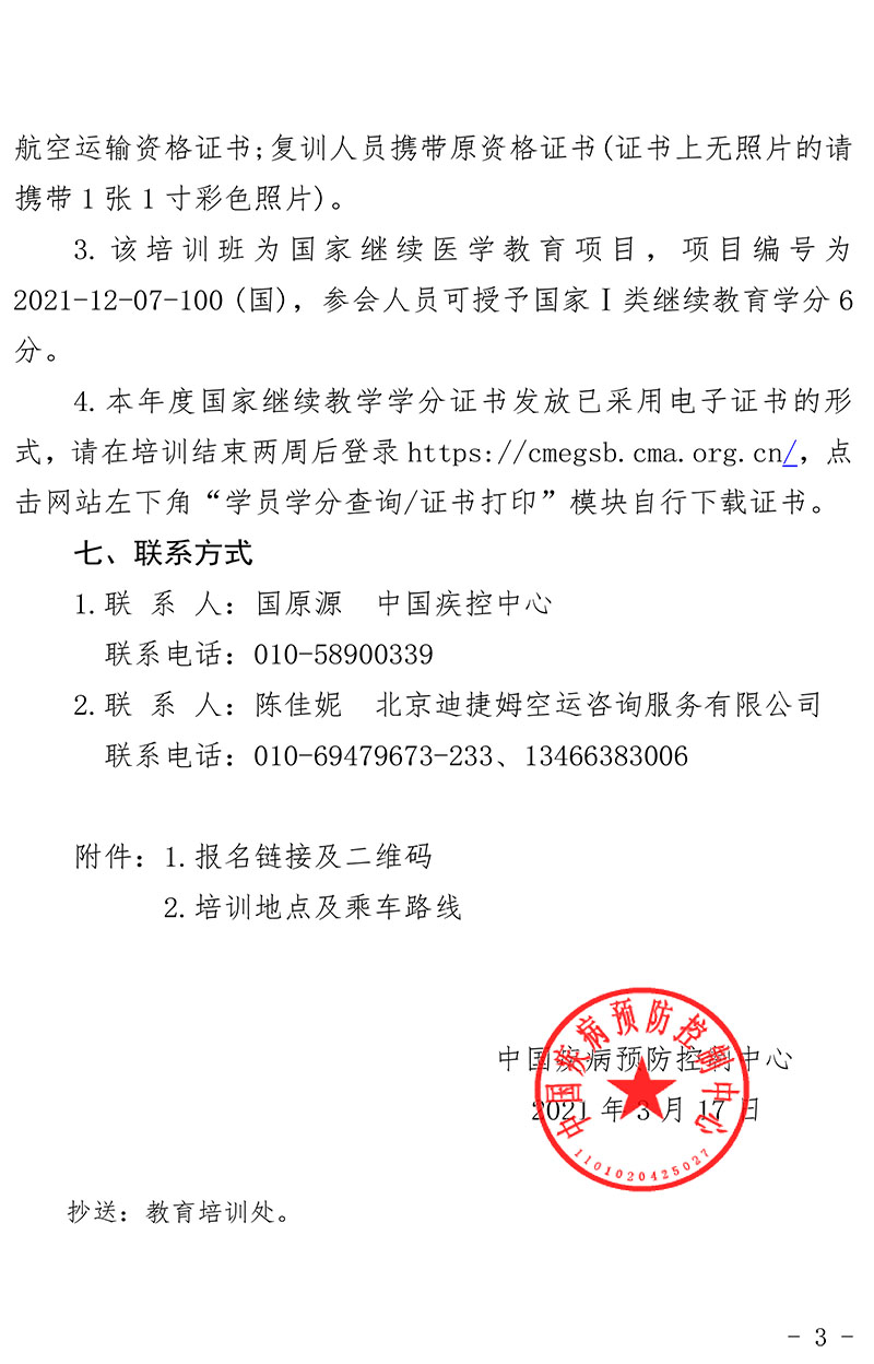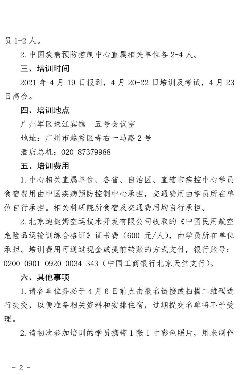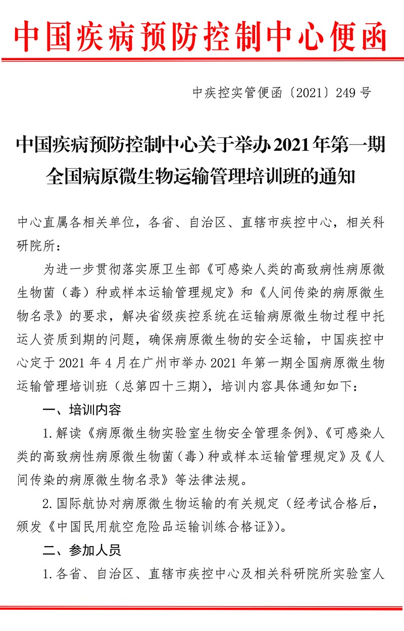 中国疾病预防控制中心关于举办2021年第一期 全国病原微生物运输管理培训班的通知